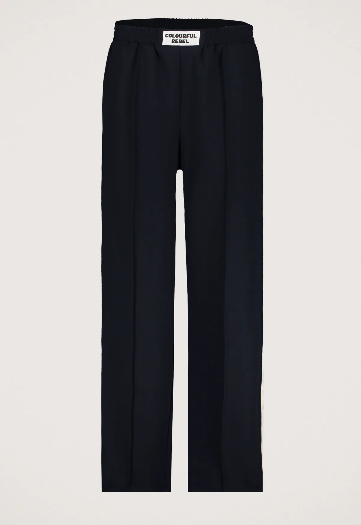 Dit is de Vella Straight leg pants van het merk Colourful Rebel. 72% Polyester, 25% Viscose, 3% Elastaan Binnenstebuiten machinewas 30, niet in de droger, strijken of stomen op lichte temperatuur, niet bleken, wassen met gelijke kleuren Regular fit Steekzakken Elastieke taille