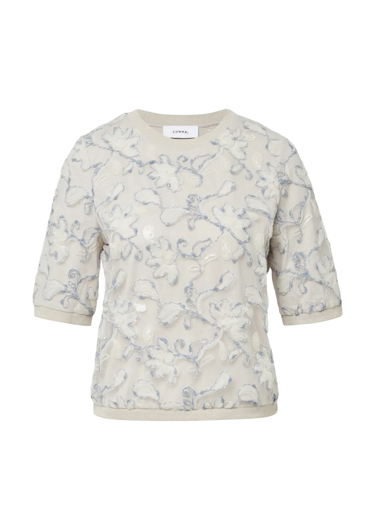 Blouse type: Blouseshirt; Design: Geribbelde kraag; Motief: Bloemenprint; Kraag: Zonder kraag; Details: Pailletten, Borduursels; Extra's: All-over patroon; Pasvorm: Normale pasvorm; Armlengte: Halve mouw; Lengte: Normale lengte
