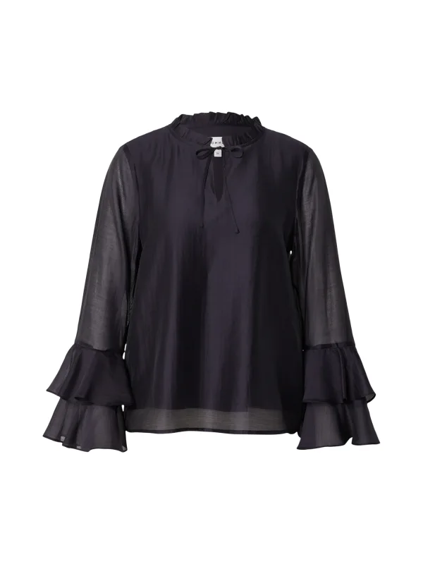 Blouse type: Wijde blouse; Design: Gevoerde zoom/rand, Rechte zoom, Om te knopen/binden; Materiaal: Lyocell; Motief: Mélange; Kraag: Tuniek kraag; Details: Ruches; Extra's: Licht transparant, Op staal naden, Lichte stof; Pasvorm: Normale pasvorm; Armlengte: Lange mouw; Lengte: Normale lengte