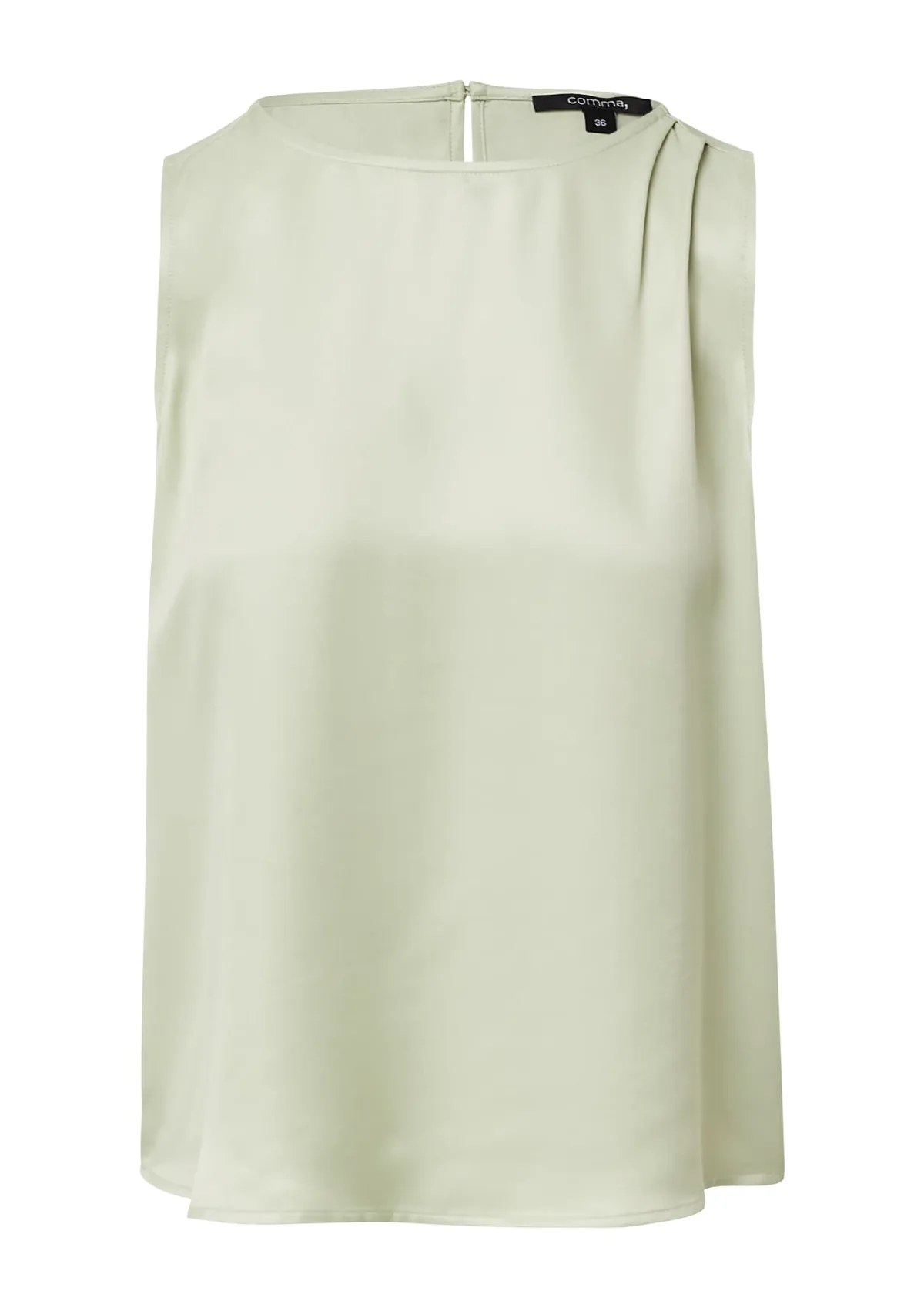 Blouse type: Blouseshirt; Design: Keyholesluiting, Ronde zoom; Type sluiting: Knoopsluiting; Materiaal: Satijn; Motief: Effen; Kraag: Zonder kraag; Details: Cut-outs, Plooien; Extra's: Op staal naden, Voelt aan als zijde; Pasvorm: Normale pasvorm; Armlengte: Mouwloos; Lengte: Normale lengte