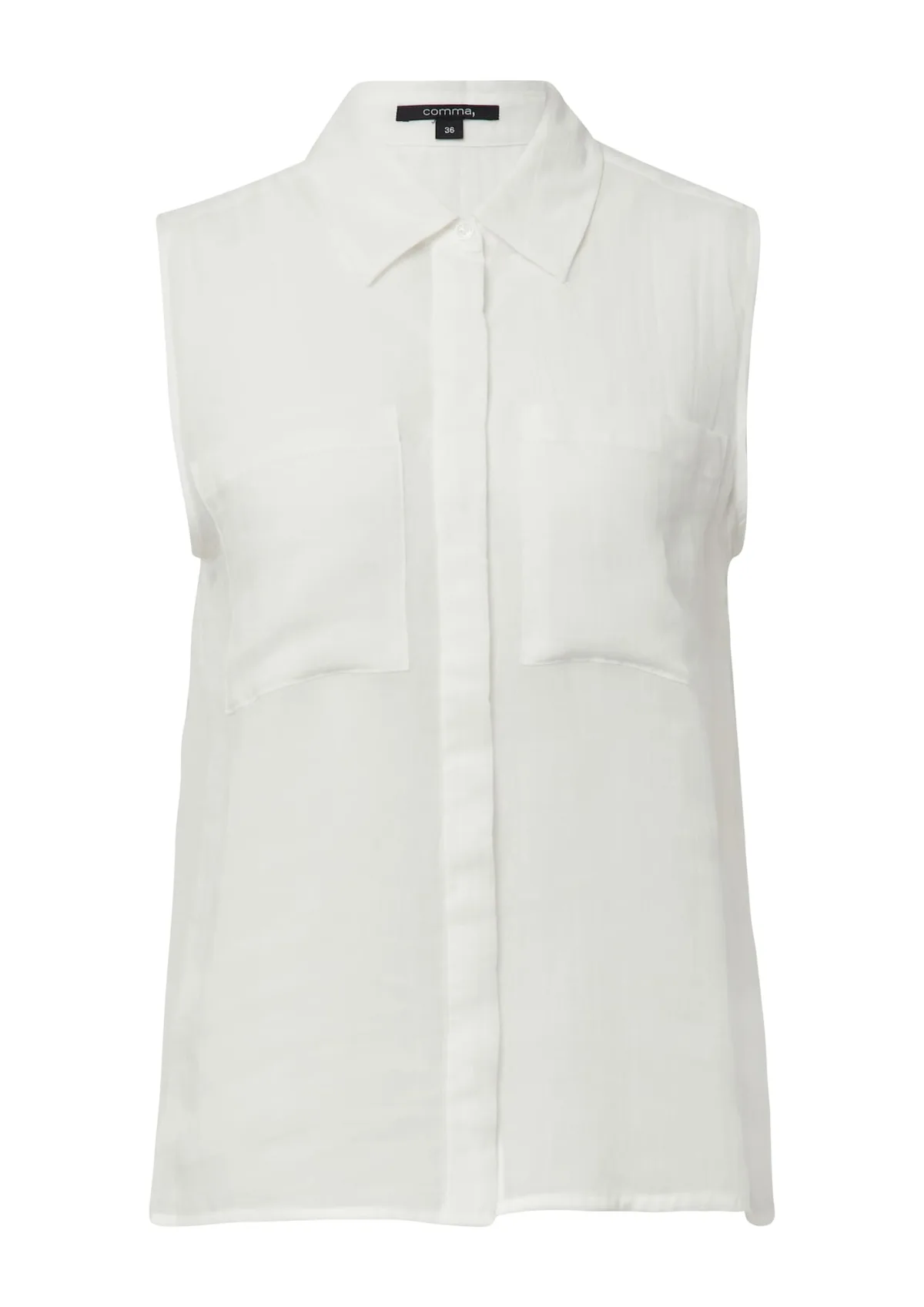 Blouse type: Klassieke blouse; Design: Borstzak; Type sluiting: Knoopsluiting; Materiaal: Mousseline; Motief: Effen; Kraag: Kentkraag; Details: Plooien; Extra's: Licht transparant; Pasvorm: Normale pasvorm; Armlengte: Mouwloos; Lengte: Normale lengte