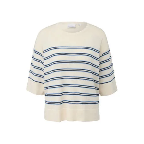 Deze luchtige comma gebreide trui is een praktische basis voor lichte, comfortabele outfits in het voorjaar en de zomer. Het fijngebreide materiaal van lyocell en katoen voelt soepel aan op de huid en is prettig op warmere dagen. Het gestreepte dessin in ecru en blauw geeft een frisse uitstraling, terwijl de relaxed fit zorgt voor een losse, ontspannen look.Gestreept fijn breisel met relaxed pasvorm Gemaakt van lyocell met katoen voor een zachte, soepele touch Fijn breisel dat licht en luchtig aanvoelt Gestreept motief in ecru en blauw voor een frisse, moderne uitstraling Relaxed fit en korte, wijde mouwen voor een comfortabele pasvorm Oversized schouders voor een nonchalante look Ronde hals die mooi aansluit rondom de halslijn Korte lengte, ideaal boven een hoge taille broek of rok Zijsplitten voor extra bewegingsvrijheid en een speels effect aan de zoomEenvoudig te stylen op vrije dagen en naar kantoorDoor de korte lengte komt deze trui goed tot zijn recht op een high waist jeans, een pantalon of een rechte rok. Het luchtige breisel maakt het een geschikt item om solo te dragen op mildere dagen, of over een top als extra laagje.comma: moderne stijl met aandacht voor detailHet merk comma richt zich op eigentijdse mode met een vrouwelijke uitstraling en doordachte details. De collecties zijn afgestemd op dagelijks gebruik, met items die onderling goed te combineren zijn. Zo bouw je stap voor stap een garderobe op die past bij een druk leven, waarin werk, gezin en vrije tijd elkaar afwisselen.Een lichte, gestreepte knit die zowel in het weekend als op werkdagen gemakkelijk in je kledingroutine past.