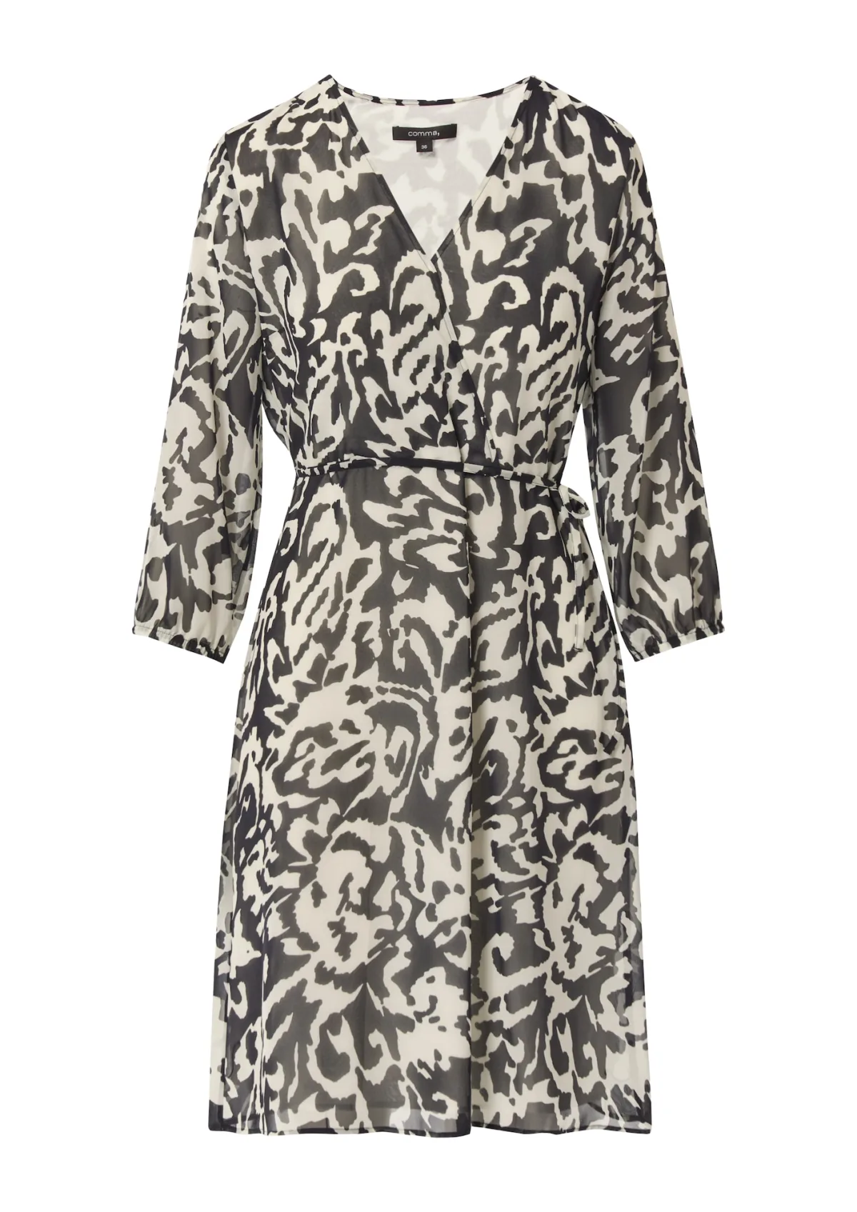 Design: Tailleband; Materiaal: Chiffon; Halstype: V-hals; Motief: Dierenprint; Details: Gedrapeerd, Wikkel design; Extra's: All-over patroon; Lengte: Knielengte; Snit: Recht; Pasvorm: Slanke pasvorm; Armlengte: Driekwart mouw