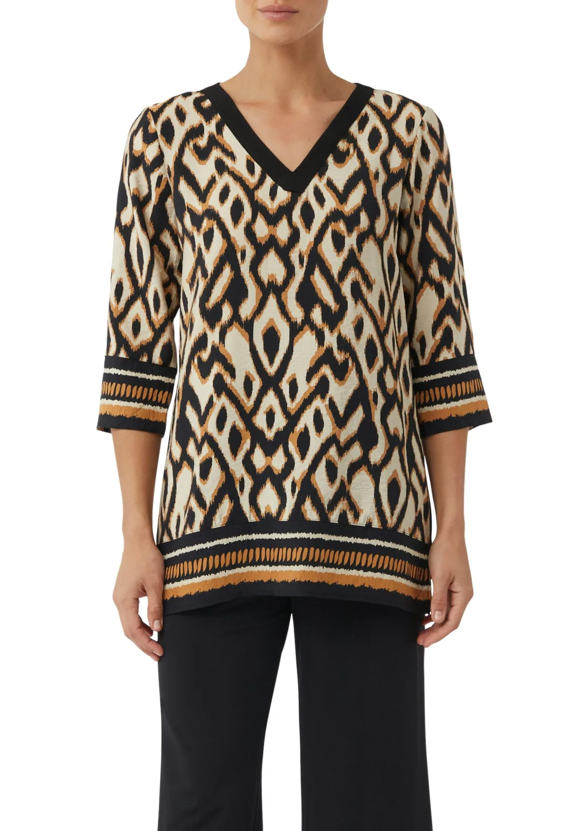 Blouse type: Blouseshirt; Design: Zijdelingse inkepingen; Materiaal: Viscose; Motief: Dierenprint; Kraag: Zonder kraag; Extra's: All-over patroon; Pasvorm: Losse pasvorm; Armlengte: Driekwart mouw; Lengte: Normale lengte