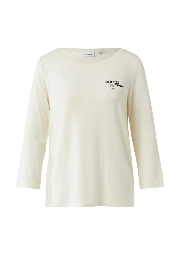 Design: Gevoerde zoom/rand, Rechte zoom; Materiaal: Jersey; Halstype: Boothals; Motief: Tekst print; Details: Sierstenen; Extra's: Op staal naden, Voelt zacht aan; Pasvorm: Normale pasvorm; Armlengte: Driekwart mouw; Lengte: Normale lengte