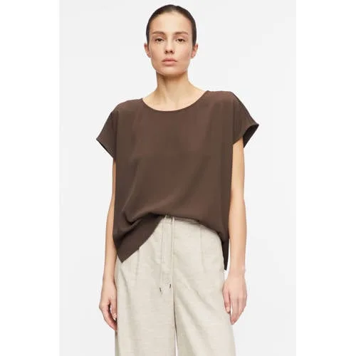 Deze donkerbruine dames top met korte mouw van comma is een rustige basic met een nette uitstraling. De effen kleur en de ronde hals maken het een veelzijdig item, terwijl de rechte korte mouwen zorgen voor een ontspannen look. De soepel vallende stof met lichte stretch volgt je bewegingen prettig, ideaal voor een drukke werkdag of een etentje na kantoor.Details die het verschil maken Ronde hals voor een tijdloze, vrouwelijke uitstraling Korte, rechte mouwen voor luchtig draagcomfort in het voorjaar Zoom met zijsplitten waardoor de top mooi valt over je broek of rok Effen donkerbruine kleur, makkelijk te combineren met lichte en donkere tinten Soepel materiaal met een beetje stretch voor een fijne pasvorm Onderdeel van de Boutique collectie voor een verzorgde, moderne stijlVeelzijdig in je dagelijkse outfitsDeze top past goed in een garderobe waarin je graag combineert. Draag de blouse op een nette pantalon voor kantoor of op een donkerblauwe jeans voor een meer casual dag. De zijsplitten in de zoom geven extra bewegingsvrijheid en laten de stof mooi om je heupen vallen, of je de top nu los draagt of deels in je broek stopt.comma: moderne mode met een verzorgde uitstralingcomma richt zich op kleding die je eenvoudig aantrekt in je dagelijkse leven, met een verzorgde en modieuze uitstraling. De collecties zijn afgestemd op vrouwen die houden van stijlvolle items die onderling goed te combineren zijn. Zo bouw je met weinig moeite een garderobe op die bij veel momenten van de dag past.Een rustige, donkerbruine basic waar je het hele seizoen weer naar grijpt.