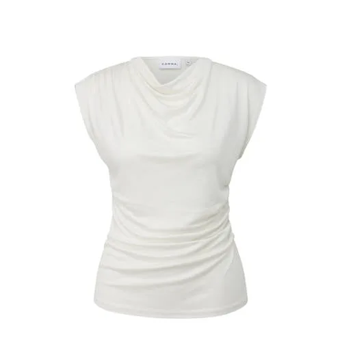 Deze comma dames top met watervalhals is een basis top voor elke dag, die net wat meer doet dan een gewoon T-shirt. De soepele jersey van 100% viscose valt soepel langs het lichaam en benadrukt de getailleerde pasvorm zonder strak te zitten. De watervalhals zorgt voor een zachte belijning, waardoor de top zowel casual als feestelijk inzetbaar is.Verfijnde details voor elke gelegenheid Watervalhals zorgt voor een speelse plooival langs het decolleté Mouwloos model dat de schouders vrij laat, handig onder een blazer of solo op warme dagen Gemaakt van 100% viscose, een zachte stof met een soepele, gladde touch Getailleerde pasvorm die het silhouet volgt zonder te knellen Effen ontwerp zonder zakken, waardoor de top makkelijk te combineren is Jersey kwaliteit die gemakkelijk meebeweegt bij elke stapVan dagelijkse look tot avondoutfitDeze top past bij verschillende momenten op de dag. Overdag draag je de top onder een vest of blazer voor werk of een casual afspraak. In de avond combineer je hem met een rok of een broek voor een diner of feestje. Door het rustige design is de top ook geschikt als nightwear, bijvoorbeeld in combinatie met een zachte loungebroek.comma, moderne stijl met een chique twistcomma ontwerpt mode met een moderne uitstraling. De collecties sluiten aan op een druk leven waarin werk, gezin en sociale momenten elkaar afwisselen. Met deze top haal je een item in huis dat er verzorgd uitziet en zich makkelijk laat stylen met andere favorieten uit je kast.Een veelzijdige top die zich eenvoudig aanpast aan jouw dag en avond.