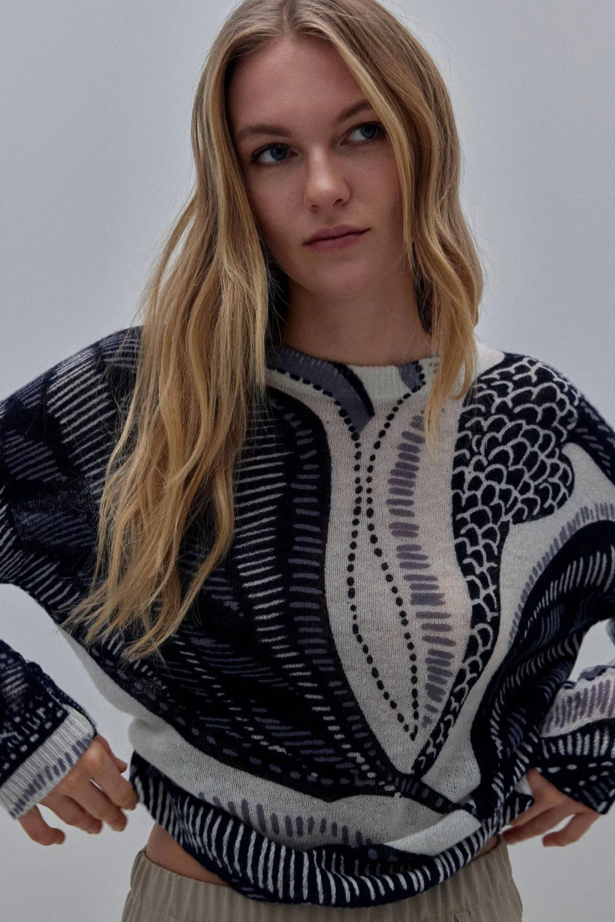 Design: Geribd ceintuurtje; Materiaal: Knitwear; Halstype: Ronde hals; Extra's: All-over patroon; Pasvorm: Normale pasvorm; Armlengte: Lange mouw; Lengte: Normale lengte