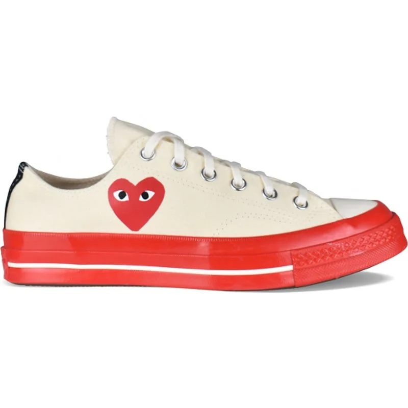 Comme Des Garçons Play x Converse sneakers.Lichtbeige canvas.Handtekening rood hartlogo aan de buitenkant.Contrasterende rode lakrubberen zool.Witte rubberen ronde neus.Vetersluiting.Contrasterende naden.