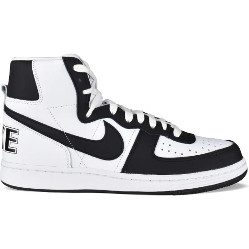 Comme Des Garçons Play x Nike Terminator hoge sneakers.Zwart en wit leer.Handtekening swoosh-logo aan de buitenkant. Nike X CDG-logo op de hiel.Perforatiedetail op de neus.Tong met logopatch.Vetersluiting.Rubberen zool.