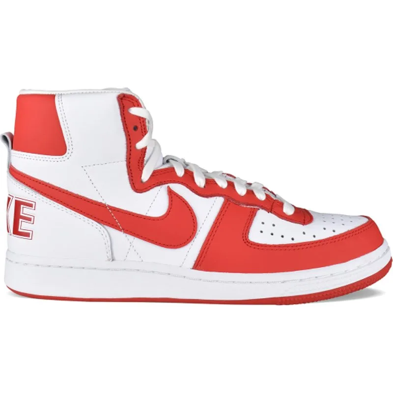 Comme Des Garçons Play x Nike Terminator hoge sneakers.In rood en wit leer.Handtekening swoosh-logo aan de buitenkant. Nike X CDG-logo op de hiel.Perforatiedetail op de neus.Tong met logopatch.Vetersluiting.Rubberen zool.