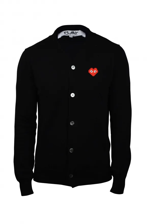 Comme des Garçons vest van zwarte wol.Knoopsluiting.Emblematisch rood hart op de borst.Lange mouwen.Geribbelde randen.