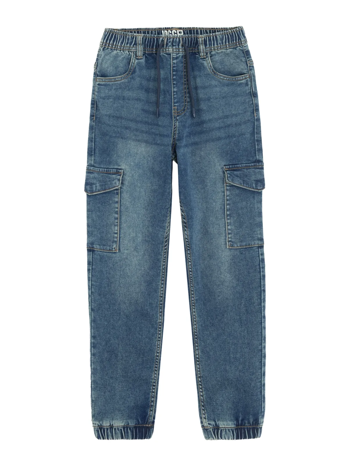 Design: Taille met trekkoord, Elastische taille/zoom, Cargozak, Zakken aan de zijkant; Materiaal: Denim; Motief: Effen; Extra's: Contrasterende naden, Riemlussen; Wassing: Blauw denim; Lengte: Lang/maxi; Pasvorm: Regular