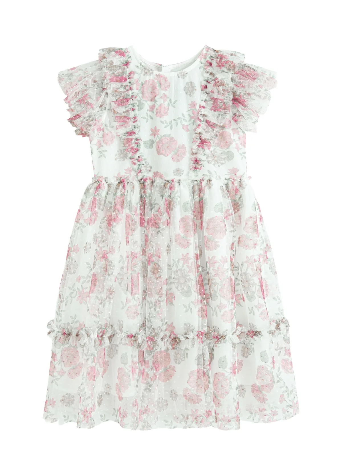 Design: Rug rits; Type sluiting: Ritssluiting; Halstype: Ronde hals; Motief: Bloemenprint; Details: Ruches; Extra's: Mesh, All-over patroon; Lengte: 3/4 lengte; Pasvorm: Losse pasvorm; Armlengte: Kwartmouw
