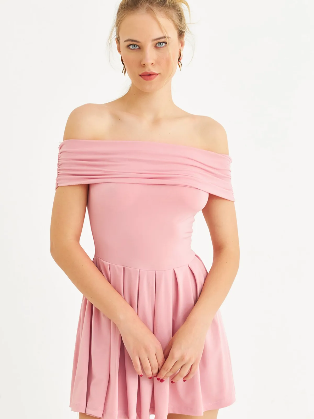 Design: Gevoerde zoom/rand, Strapless/off-shoulder; Halstype: Carmen hals; Motief: Effen; Details: Plooien, Gedrapeerd; Extra's: Op staal naden, Gladde stof; Lengte: Kort/mini; Snit: Getailleerd; Pasvorm: Slanke pasvorm; Armlengte: Kwartmouw