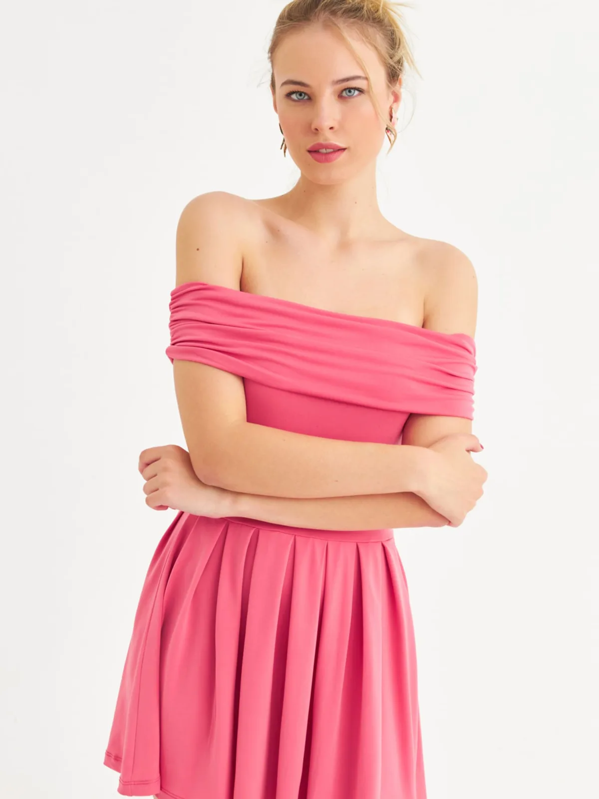 Design: Gevoerde zoom/rand, Strapless/off-shoulder; Halstype: Carmen hals; Motief: Effen; Details: Plooien, Gedrapeerd; Extra's: Op staal naden, Gladde stof; Lengte: Kort/mini; Snit: Getailleerd; Pasvorm: Slanke pasvorm; Armlengte: Kwartmouw