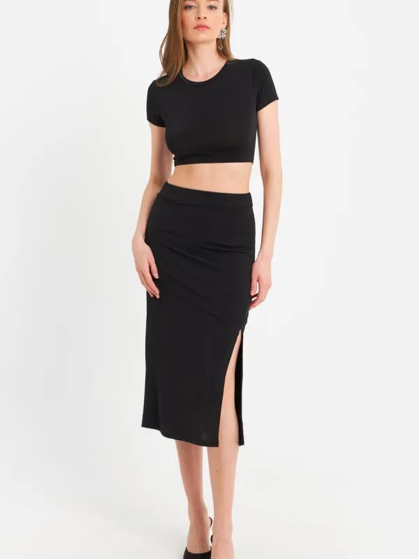 Design: Gevoerde zoom/rand, Geribbelde kraag, Elastische taille/zoom, Zijdelingse inkepingen; Voering: Niet gevoerd; Materiaal: Jersey; Motief: Effen; Kraag: Zonder kraag; Extra's: Op staal naden, Voelt zacht aan; Lengte: 3/4 lengte; Pasvorm: Slanke pasvorm; Armlengte: Kwartmouw; Taillehoogte: High waist