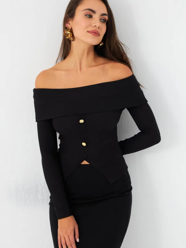 Design: Gevoerde zoom/rand, Asymmetrische zoom, Knop placket, Geribbeld gebreid; Materiaal: Jersey; Halstype: Carmen hals; Motief: Effen; Details: Wikkel design; Extra's: Op staal naden, Voelt zacht aan, Huidvriendelijk materiaal; Pasvorm: Slanke pasvorm; Armlengte: Lange mouw; Lengte: Normale lengte