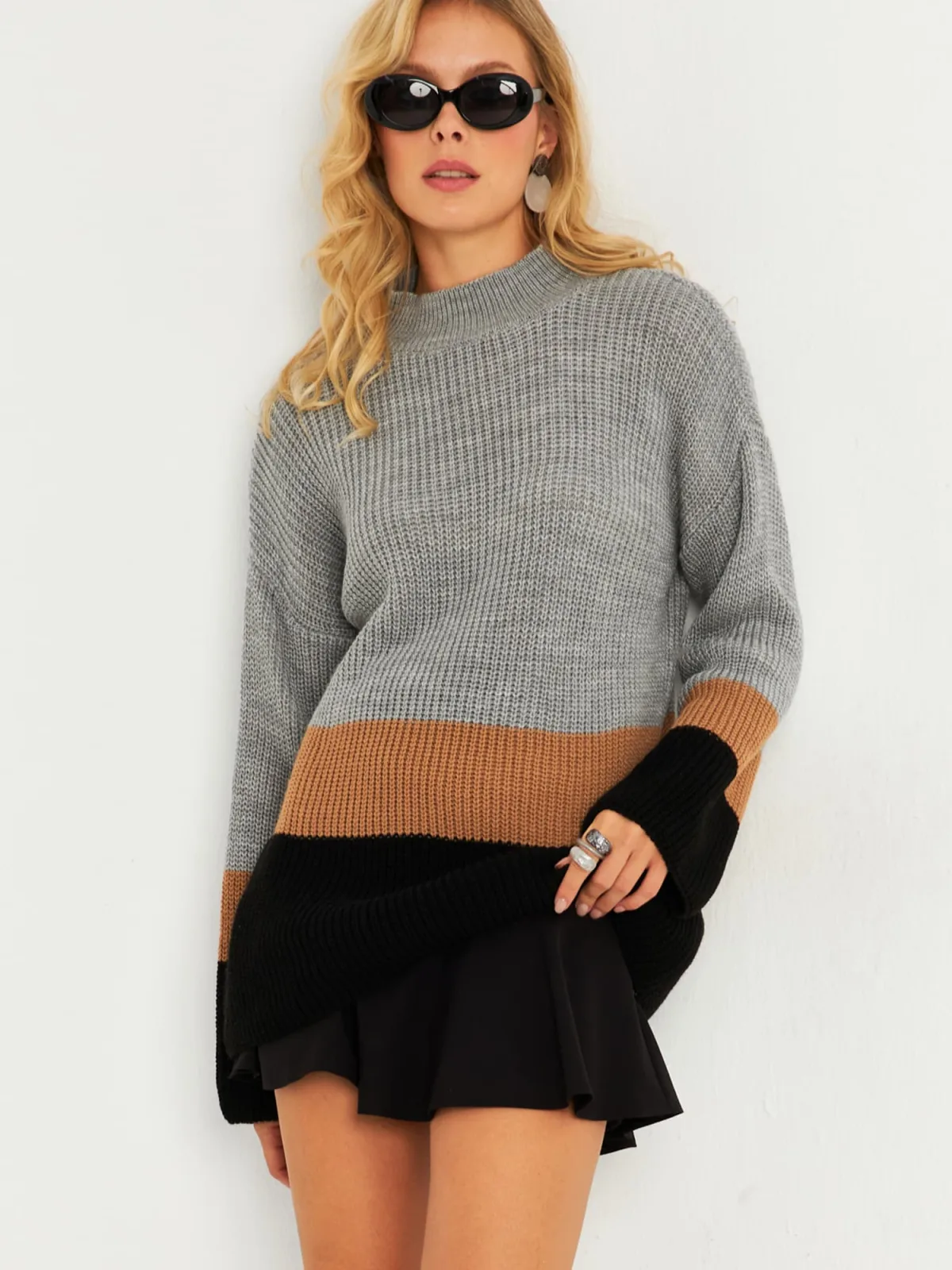 Design: Geribd ceintuurtje, Geribbeld gebreid, Overcut schouder; Materiaal: Knitwear; Halstype: Opstaande kraag; Motief: Color-Blocking; Extra's: Met textuur, Voelt zacht aan; Pasvorm: Losse pasvorm; Armlengte: Lange mouw; Lengte: Lange pasvorm