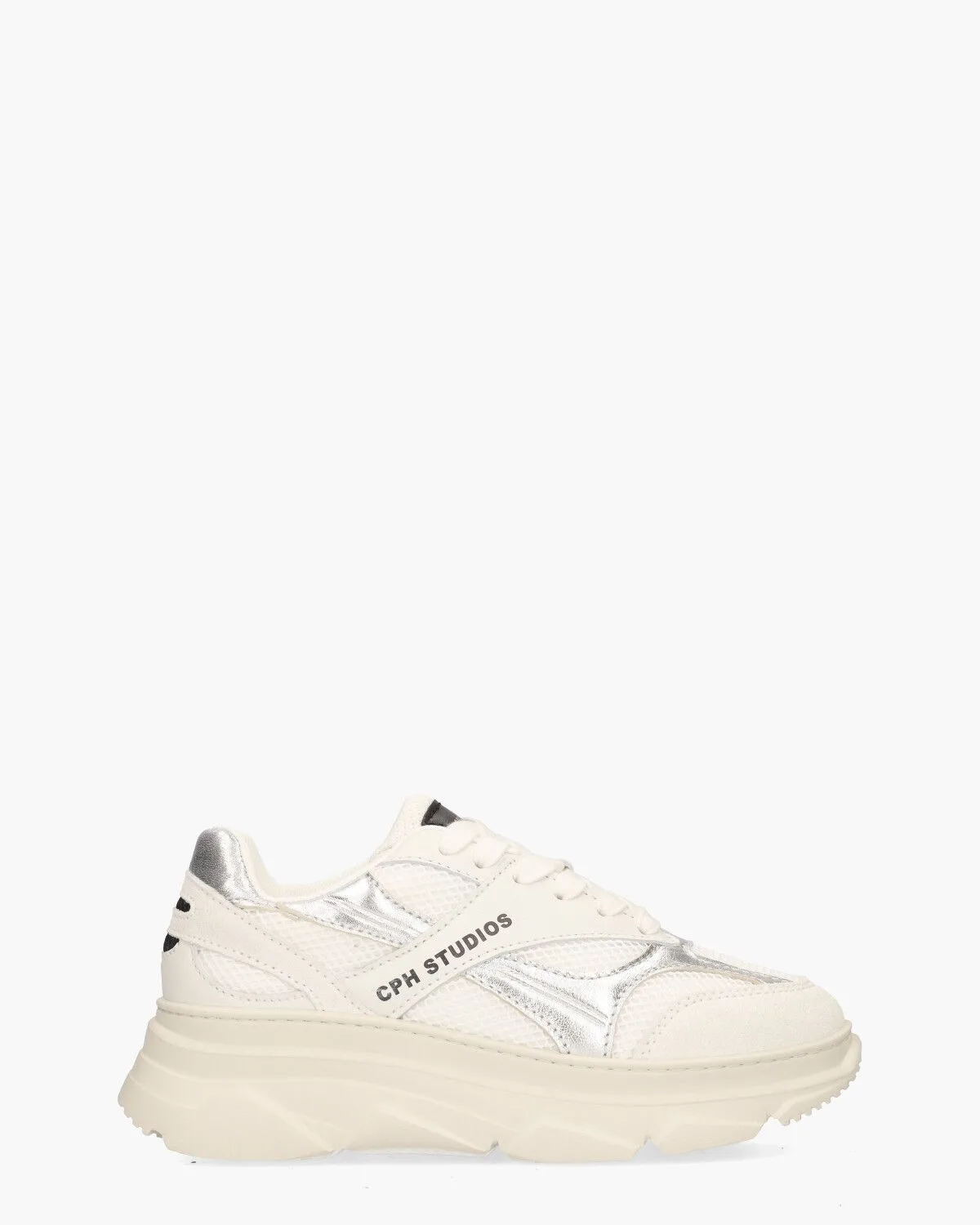 Deze sneakers voor dames, model CPH54 van Copenhagen, zijn een onmisbare aanvulling op je garderobe. Dit trendy model combineert wit mesh, leer en suède met metallic zilver voor een stijlvolle look. De binnenkant en het uitneembare voetbed zijn respectievelijk in stof en leer uitgevoerd wat zorgt voor extra comfort en duurzaamheid. De witte