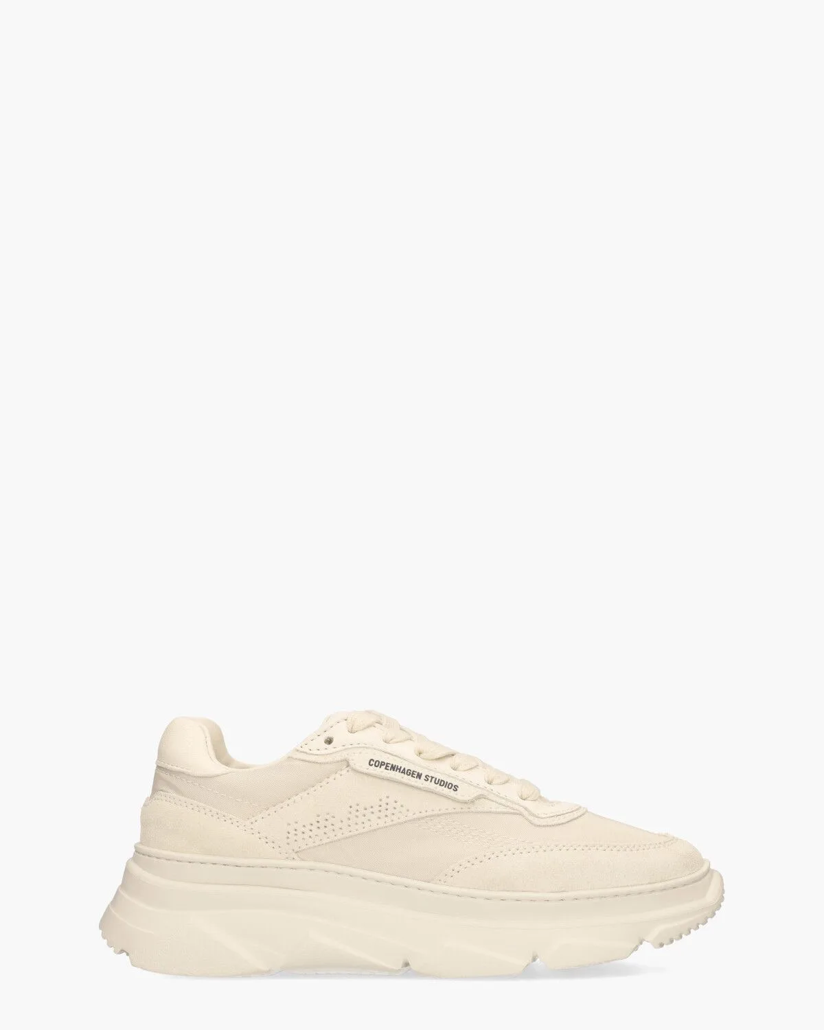 De CPH56 Material Mix lage sneakers voor dames combineren een trendy design met hoogwaardige materialen. Het bovenwerk bestaat uit een stijlvolle mix van leer, nylon en suède in een gebroken witte tint. De badstoffen binnenkant biedt een ademend en comfortabel gevoel, terwijl de zachte leren binnenzool extra draagcomfort toevoegt. De
