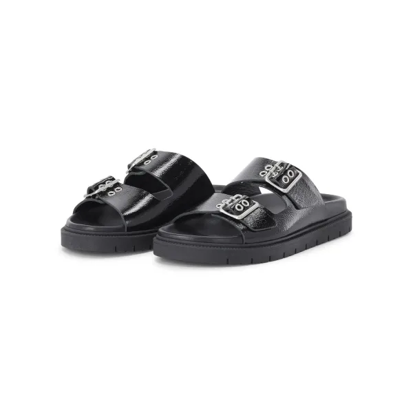 Deze sandalen van zacht glad leer vallen op door hun markante silhouet en het expressieve design. De dubbele band met glanzende metalen gespen geeft ze een verfijnde touch, terwijl de open, ronde teenpartij voor lichtheid zorgt. Een subtiele logo-print op de binnenzool en de platte zool met een licht profiel en gevormd voetbed bieden zowel stijl als comfort - perfecte metgezellen voor modieuze optreden.
