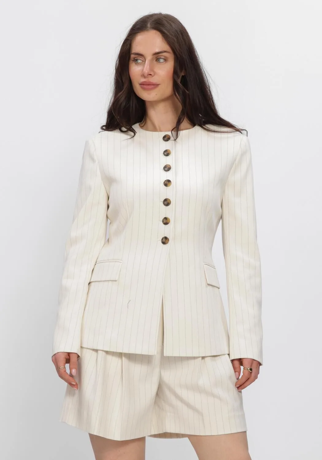 Omarm de warmte van het voorjaar en de zomer met de CMTAILOR-BLAZER van COPENHAGEN MUSE. Deze ecru, getailleerde blazer met subtiele streep geeft je outfit direct een geraffineerde twist. De elegante knopen en schoudervullingen creëren een gestroomlijnd silhouet. Maak je look compleet en combineer de blazer met de bijpassende short of een lichte, zwierige jurk. Draag de blazer naar een stijlvolle lunch op het terras of een zakelijke bijeenkomst. Voeg dit tijdloze item toe aan je garderobe.