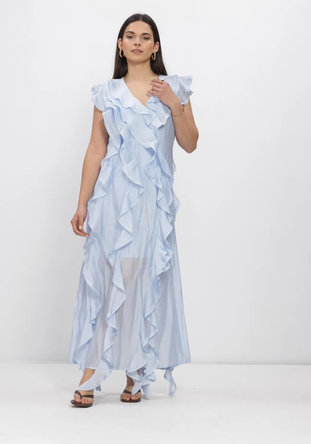 dames midi-jurk van Copenhagen Muse;Lyocell-mix;A-lijn;Model 'MOLLY';V-hals;Volants;borstwijdte bij maat s: 40 cm;Mouwlengte bij maat S: 131 cm