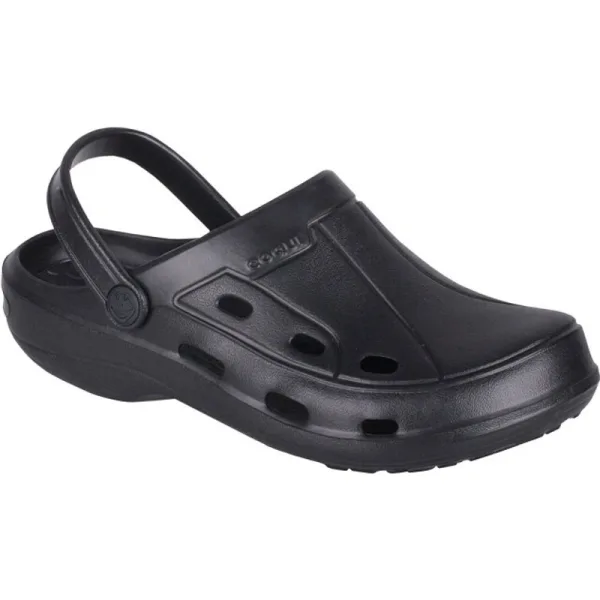 Materiaal: CoquiAir. Buitenzool: Niet afgetekend, met profiel. CoquiAir, draaibaar hielriempje, sneldrogend, schokabsorberend. Vlakke. Ontwerp: Gaten, Logo. Anti-Bacterieel. Sluiting: Slip-on.