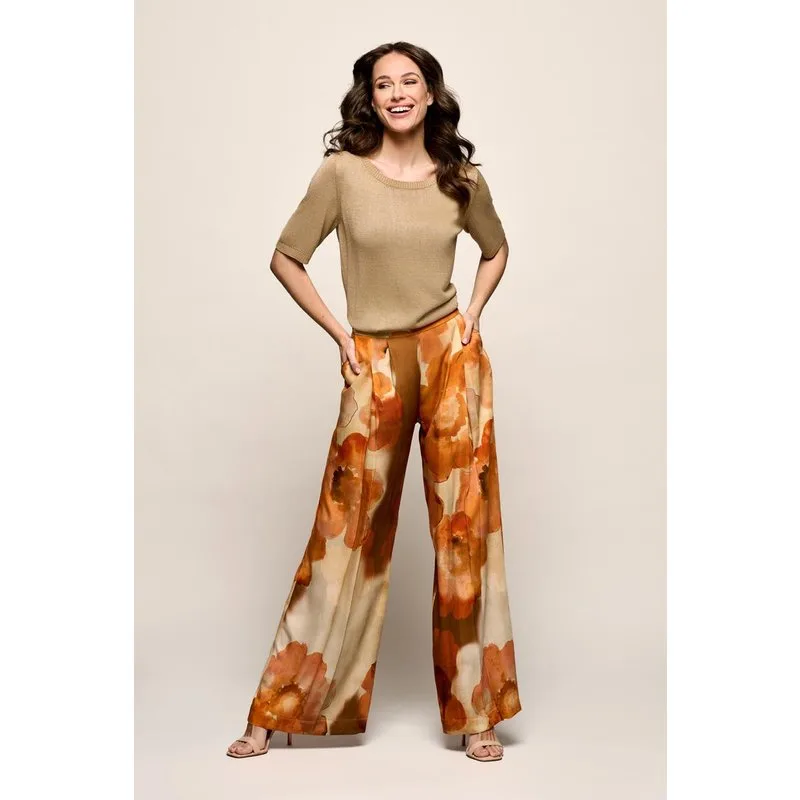 Mart Visser Corby palazzo broek in oranje print – elegant en opvallendVoeg kleur en zomerflair toe aan je garderobe met de Corby palazzo broek van Mart Visser. Deze soepel vallende broek is uitgevoerd in een warm, multicolor oranje dessin dat doet denken aan een aquarel, met een schilderachtige bloemenprint die een frisse, zomerse uitstraling geeft. De wijde, rechte pijpen creëren een optisch verlengend effect en zorgen voor een elegant, zwierig silhouet bij elke stap. Gemaakt van 100% hoogwaardige viscose, combineert het ontwerp een luxueuze glans met een optimaal ademend vermogen, perfect voor zonnige dagen. De broek sluit prachtig aan in de taille en is voorzien van een elastische inzet aan de achterzijde van de tailleband, wat een perfecte pasvorm en hoog draagcomfort garandeert. Net als bij andere items uit deze collectie is elke broek uniek door de willekeurige plaatsing van het schilderachtige dessin. Of je nu kiest voor een zakelijke afspraak of een chique avondgelegenheid, deze viscose palazzo broek vormt de ideale basis voor een stijlvolle, vrouwelijke outfit.