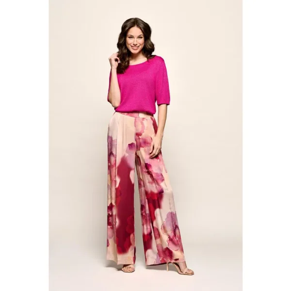 Roze palazzo broek – stijlvol comfort voor iedere gelegenheidDe Corby print broek in een roze multicolour dessin is een opvallende en elegante keuze voor dit seizoen. Het aquarelachtige bloemenmotief geeft de broek een verfijnde, moderne uitstraling en doet denken aan een handgeschilderd kunstwerk. Het schilderachtige dessin combineert zachte nude- en beigetinten met diverse roze en roodtinten, wat zorgt voor een vrouwelijke en artistieke look. Dankzij de vloeiende kleurovergangen straalt de broek luxe uit, en doordat het dessin willekeurig over de stof is verdeeld, is ieder exemplaar uniek. De palazzo broek valt soepel langs het lichaam en sluit mooi aan in de taille. De lange, rechte en wijde pijpen creëren een elegant silhouet en bieden tegelijkertijd een luchtig en comfortabel draaggevoel. De tailleband is aan de achterkant voorzien van elastiek voor een perfecte pasvorm. Praktische details zoals de schuine steekzakken aan de zijkant en de onzichtbare zijrits maken de broek zowel stijlvol als functioneel. De Corby print broek valt normaal qua maat en is gemaakt van 100% viscose, een licht en soepel natuurlijk materiaal. Let op: viscose kan na het wassen iets krimpen, maar met stoom kan de stof eenvoudig weer in model worden gebracht.