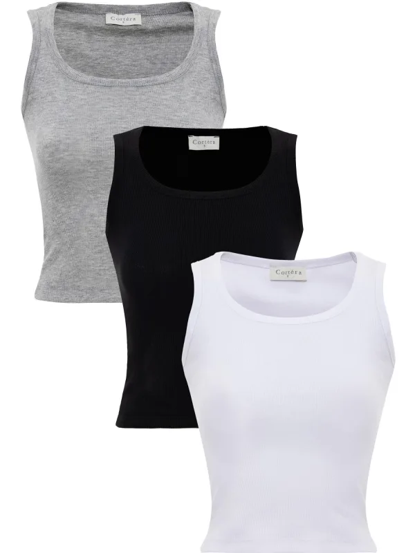 Design: Geribbelde kraag, Elastische inserts; Materiaal: Jersey; Halstype: Ronde hals; Motief: Effen; Soort bandjes: Brede bandjes; Extra's: Voelt zacht aan; Pasvorm: Slanke pasvorm; Aantal: 3 Pack; Armlengte: Mouwloos; Lengte: Korte pasvorm