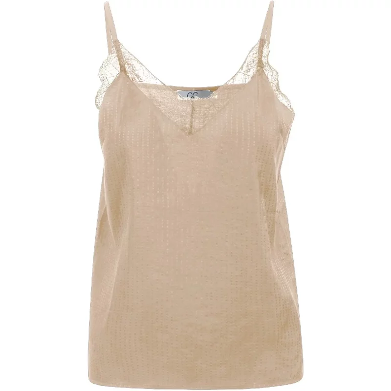 Een essentiele basic in jouw garderobe, deze nude spaghettitop Luna met kant. De ideale top om ergens onder te dragen. De nude top met V-hals heeft een subtiel werkje, vertelbare bandjes, kanten details bij de hals en een rechte onderzoom. Materiaal: 80% viscose, 20% polyamide