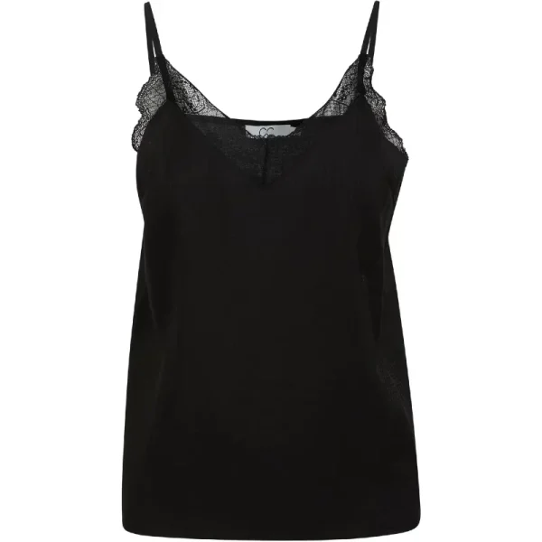 Een essentiele basic in jouw garderobe, deze zwarte spaghettitop Luna met kant. De zwarte top met V-hals heeft vertelbare bandjes, kanten details bij de hals, een subtiel werkje en een rechte onderzoom. Materiaal: 80% viscose, 20% polyamide