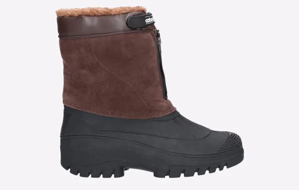 Venture hybride weerslaars van Cotswold Shoes. Een stijlvol ontwerp met een luxe imitatie suède schacht en een volledig waterdichte gevormde rubberen galosh om de elementen te bestrijden. Voorzien van een rits aan de voorkant en een warme imitatiebontvoering.