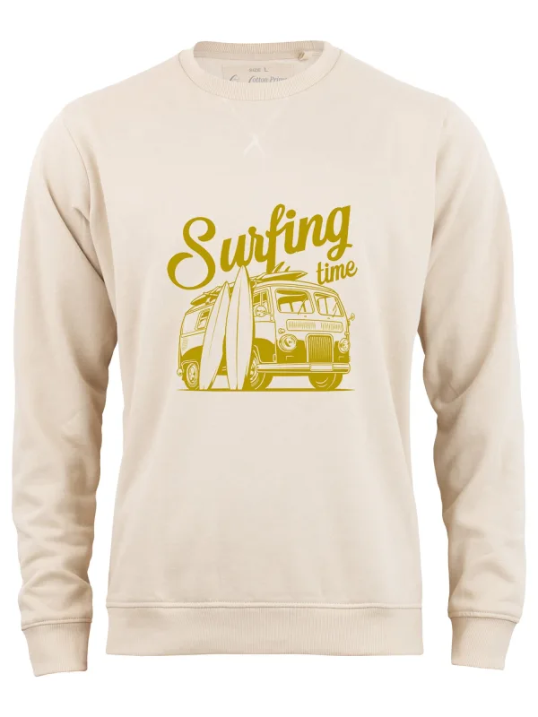 Specificaties: Cotton Prime Sweatshirt ‘Surfing Time’ lichtbeige / olijfgroen