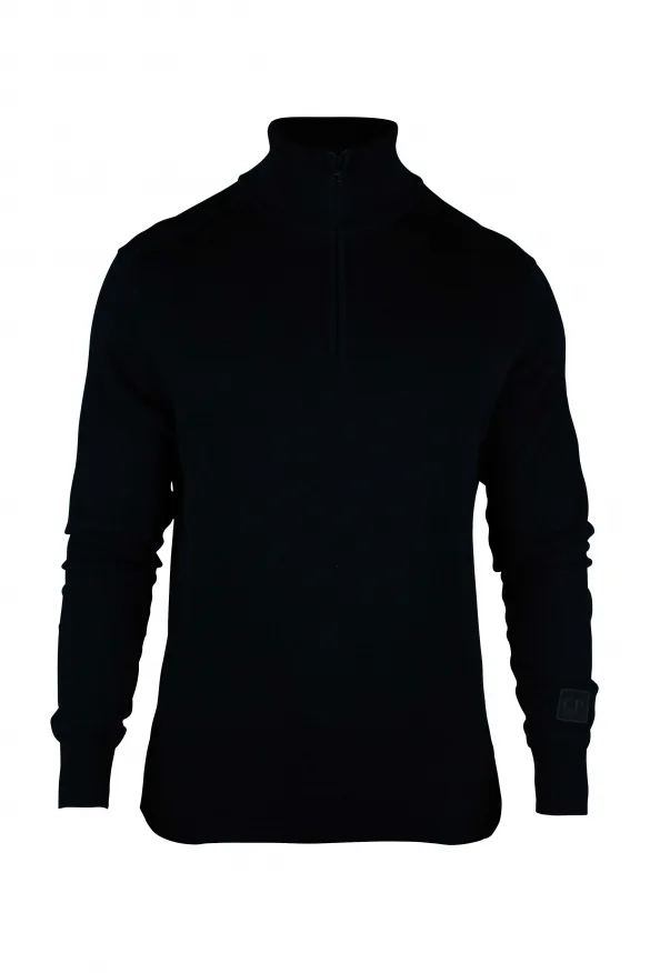 Marineblauwe fijngebreide trui van C.P Company.collectie Metropolis.Hoge kraag met semi-ritssluiting.Lange mouwen.Logopatch op de mouw.Geribbelde randen.