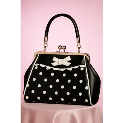 Echt een (polka)dotje! Deze zwarte tas heeft een opvallende goudkleurige metalen klipsluiting voor een echte vintage look. Uitgevoerd in zwart 'faux' leder met een print van crèmekleurige polkadots en afgewerkt met een strikje en geschulpte biesjes. Deze cutie wordt bovendien geleverd met een los, verstelbaar hengsel zodat je haar ook speels om je schouder kunt hangen. Je kunt er ook nog genoeg spulletjes in kwijt. Slechts één klik... en deze vintage treasure kan van jou zijn ;-) * Klein model * Klipsluiting * Binnenvak met 3 extra vakjes, waarvan 1 met rits * Afneembaar hengsel * Kan crossbody gedragen worden * Volledig gevoerd * Groot genoeg voor je telefoon, sleutels en een klein toilettasje