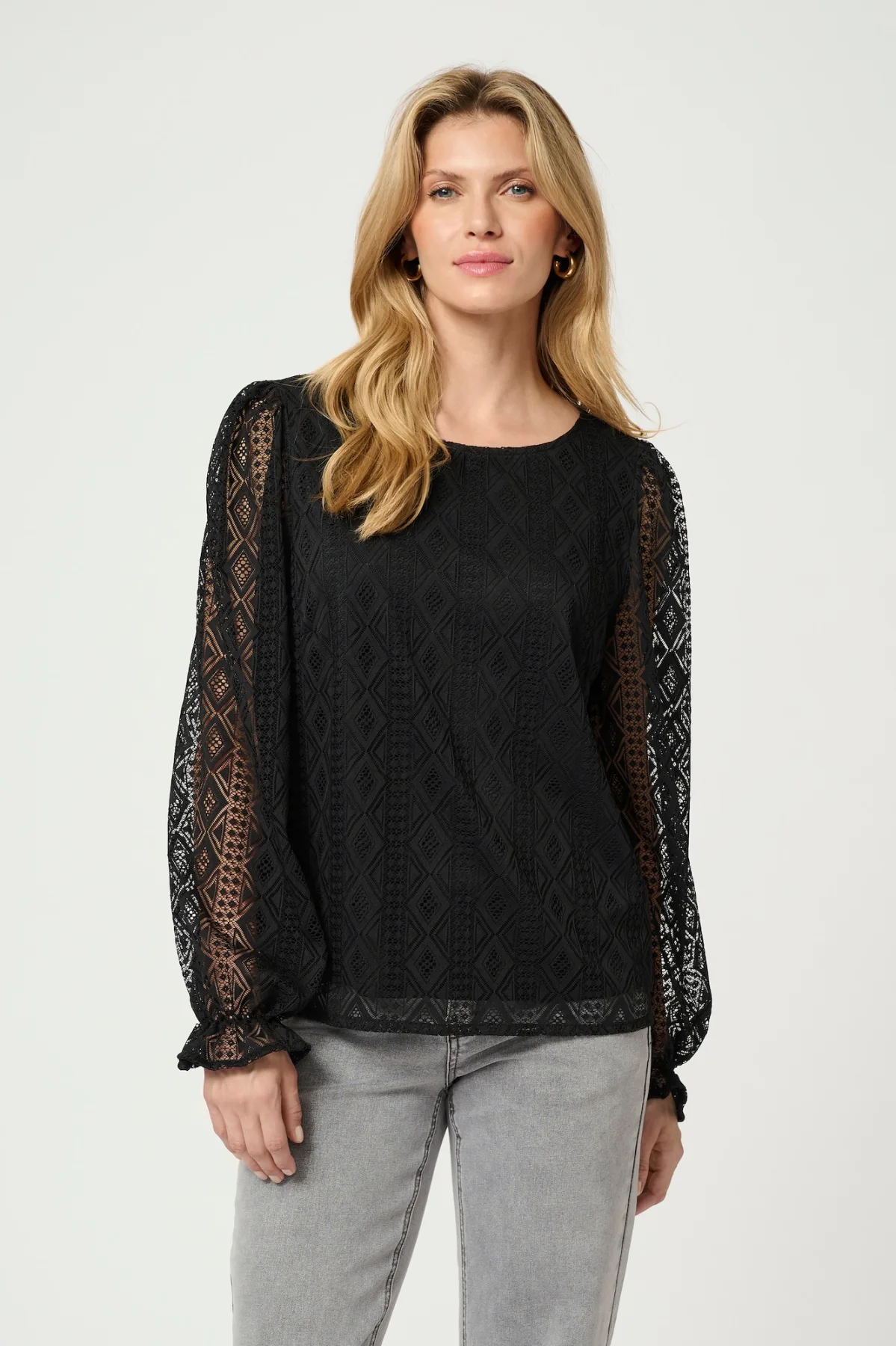 Blouse type: Blouseshirt; Design: Gevoerde zoom/rand, Pofmouwen; Type sluiting: Knoopsluiting; Motief: Effen; Kraag: Zonder kraag; Details: Ruches, Kant; Extra's: Op staal naden, Lichte stof; Pasvorm: Normale pasvorm; Armlengte: Lange mouw; Lengte: Normale lengte