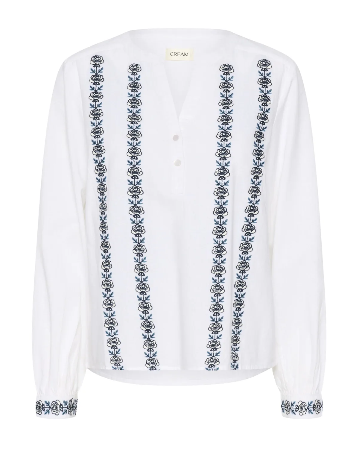 Dames blouse met losse pasvorm, V-halslijn, knoopsluiting, lange mouwen met elastische manchetten en sierlijke borduursels. Ideaal voor dagelijks gebruik.