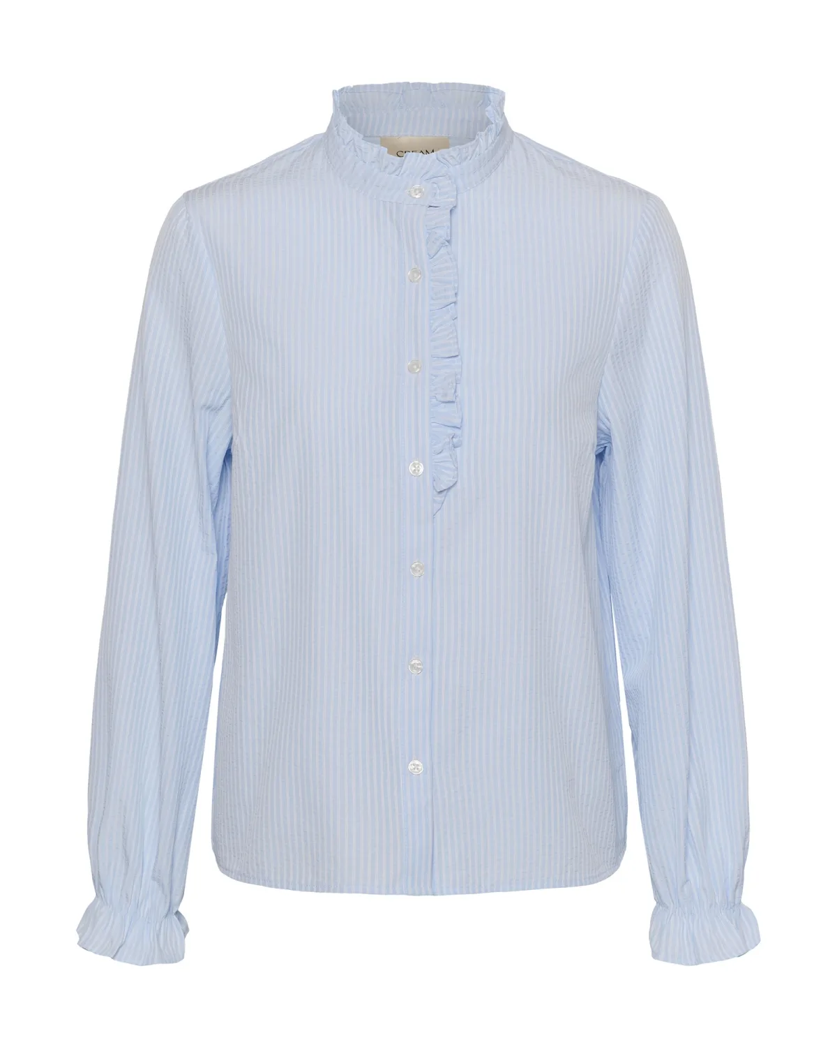 Blouse met rechte pasvorm, knoopsluiting en opstaande kraag met ruches. Ruches langs de knoopsluiting en aan de lange mouwuiteinden. Shirt heeft een subtiele verticale streep.