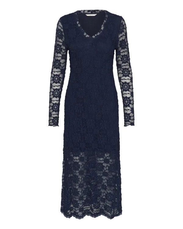 Deze damesjurk van kant heeft lange mouwen, een elegante V-hals en een flatterende, aansluitende pasvorm. De midi-lengte zorgt voor veelzijdige draagmogelijkheden en optimaal draagcomfort.