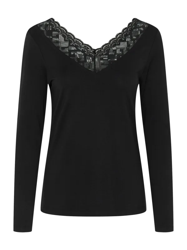 Blouse type: Blouseshirt; Design: Gevoerde zoom/rand, Rechte zoom; Materiaal: Viscose; Halstype: V-hals; Motief: Effen; Kraag: Zonder kraag; Details: Kant; Extra's: Op staal naden, Voelt zacht aan; Pasvorm: Normale pasvorm; Armlengte: Lange mouw; Lengte: Normale lengte
