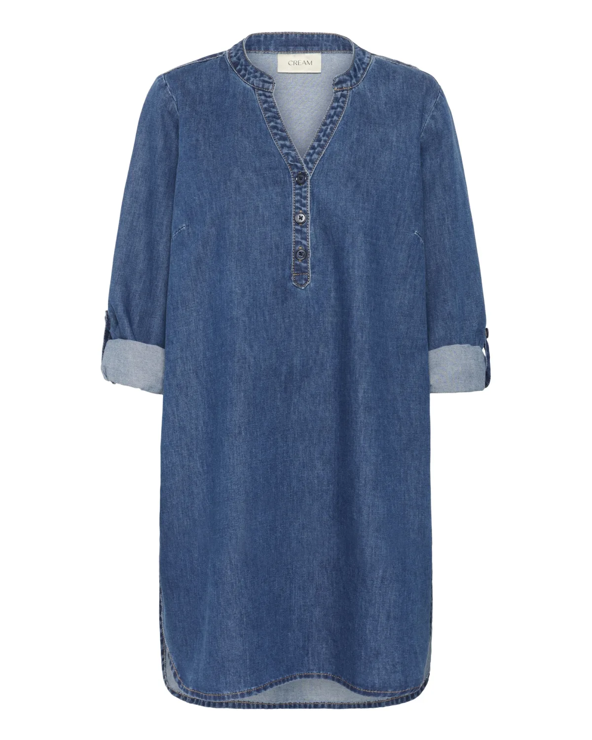 Denim tuniekjurk met een losse pasvorm, ronde V-halslijn en knoopsluiting. Lange mouwen en afgeronde zoom zorgen voor comfort en veelzijdigheid.