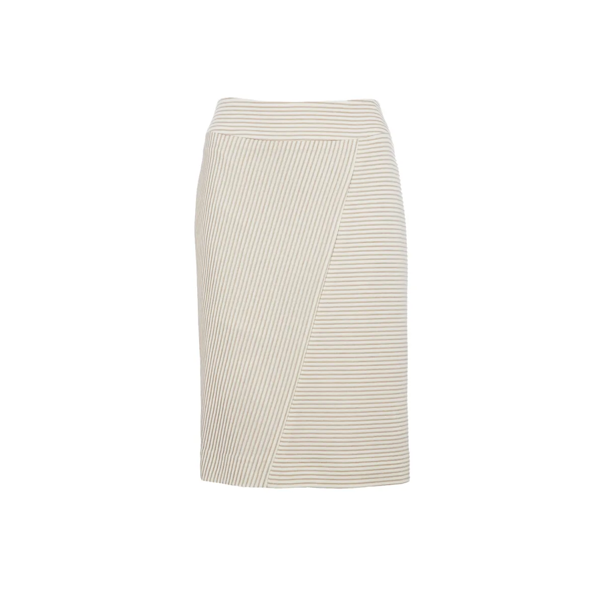 Kokerrok van een stretch gevoerde gebreide stof in een crèmekleurige strijkbout. Een diagonale naad voor en een verticale naad achter. Crème voering. Brede tailleband: 6cm. Kleine split achteraan: 9cm. Lengte voor maat 38: 61cm.