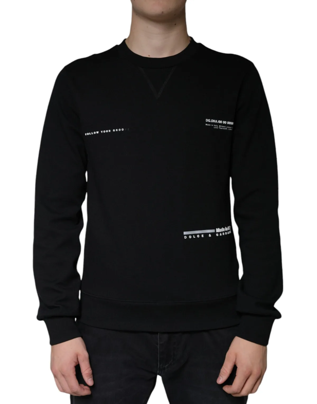 Omarm, druk je uit en til je dagelijkse stijl naar een hoger niveau. Deze Dolce & Gabbana sweater biedt ongeëvenaard comfort en een onderscheidende uitstraling. De zachte katoenmix zorgt voor comfort de hele dag, terwijl de klassieke ronde hals en lange mouwen tijdloze aantrekkingskracht bieden. Val op in de menigte met de unieke 'Follow Your Groove' grafische print, die een vleugje moderne flair aan je garderobe toevoegt. Beleef de luxe van Italiaanse ambacht, ontworpen voor moeiteloze, dagelijkse draagbaarheid. Machinewasbaar voor eenvoudig onderhoud.