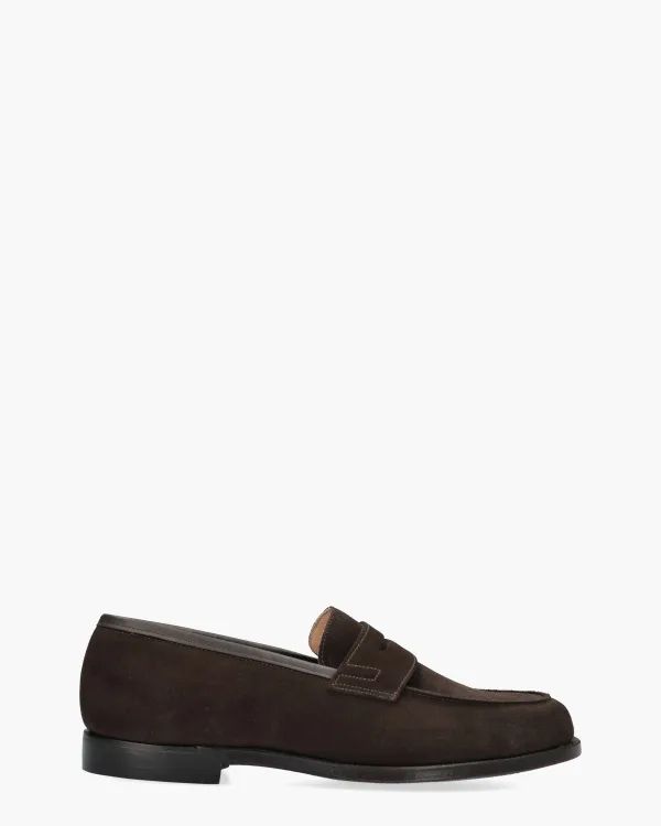 Zacht suède en Engels vakmanschap in een moderne klassieker: de Grantham 2 loafer van Crockett&Jones is een elegant model voor mannen die kiezen voor kwaliteit en uitstraling. De diepe, warme kleur donkerbruin kalfssuède past moeiteloos bij zowel zakelijke als casual outfits. De leren voering en het vaste voetbed zorgen voor een