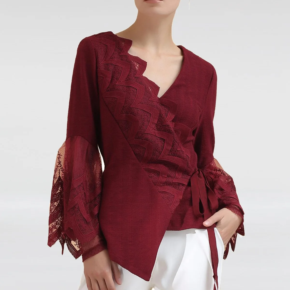 Een vrouwelijk stuk gegarneerd op mouwen en splitsing met geschulpte randkant. Gemonteerde taille bedankt snaren en warp -bevestiging. Gesneden in een gestructureerde brei, deze bovenkant moet worden gekoppeld aan eenvoudige en minimalistische stukken zoals rechte broek of een kokerrok. Productdetails: Wrap Lengte: 60 cm/ Het model meet 1m77 en heeft een maat 38 V halslijn
