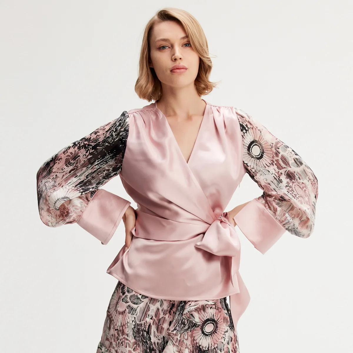 Gesneden uit een acetaatstof gemengd met een sluier die op de mouwen wordt gedrukt, markeert dit stuk het silhouet met elegantie. V halslijn en taille strakker door een riem. Om te dragen op kantoor met een formele broek of een kokerrok of de "Total" -look spelen met onze "lange chiffon rok met ruches bloemenprint". Productdetails • Vorm: gebogen in de taille • Lengte: 63 cm • V halslijn • Lange mouwen met knopen • Sluiting: op de taille worden gezet en gebogen