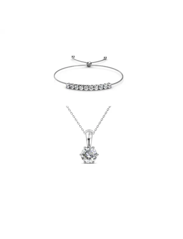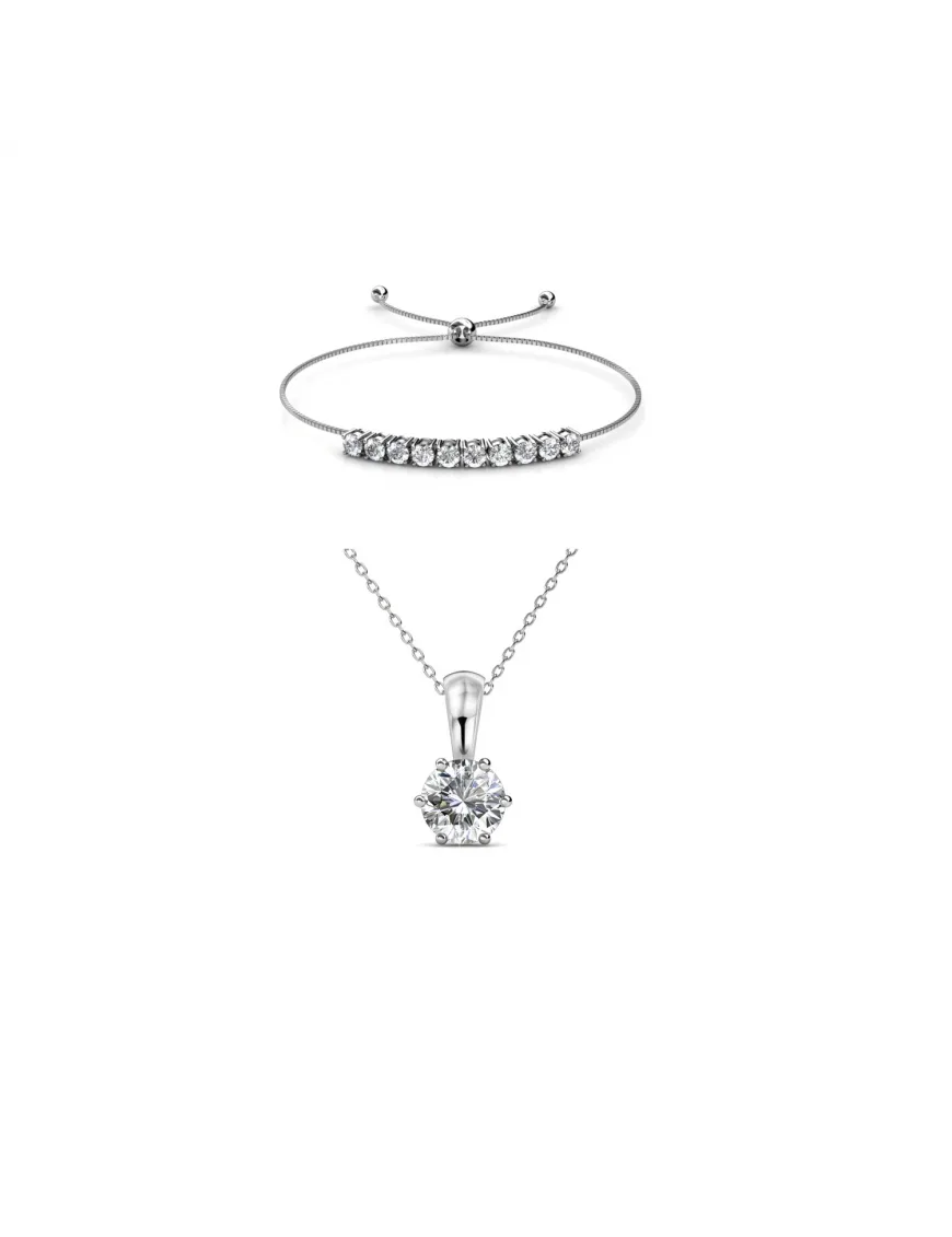 Samenstelling: Messing Afwerking: Gerhodineerd Type steen: Oostenrijks kristal Type steen : Non communique Aantal stenen (pces) : 11 Kleur steen: Kristal Lengte ketting: 400 + 50 Diameter oorbellen (mm): niet meegedeeld Lengte van armband (mm): niet meegedeeld.